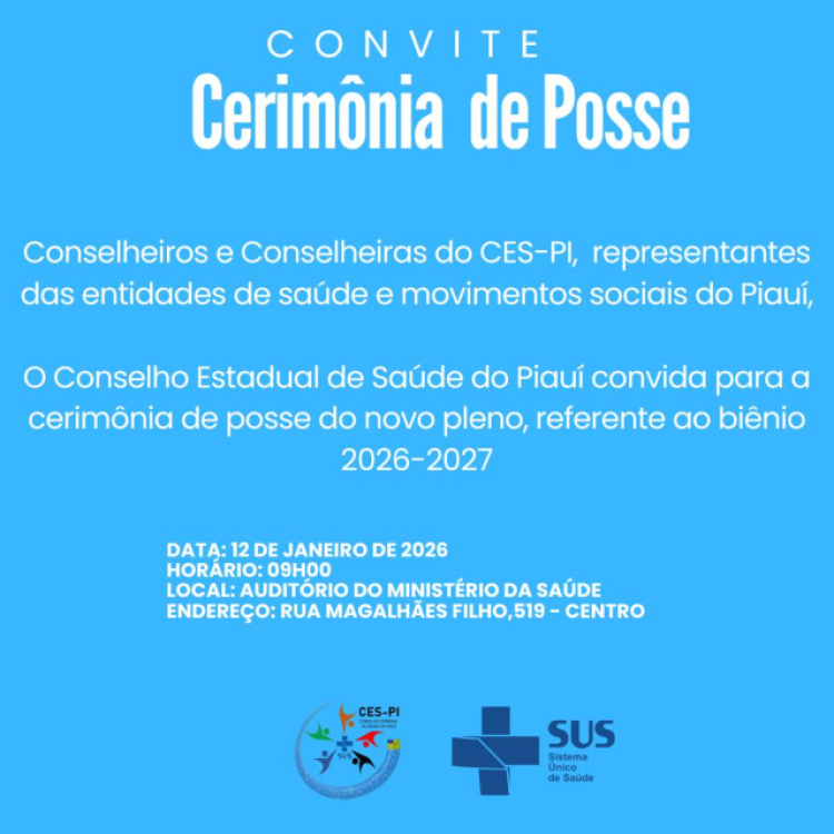 Será segunda-feira, 12 de janeiro, a posse dos Conselheiros e Conselheiras, representantes das Entidades de Saúde, Movimentos Sociais e Governo no CES-PI (Conselho Estadual de Saúde - Piauí).