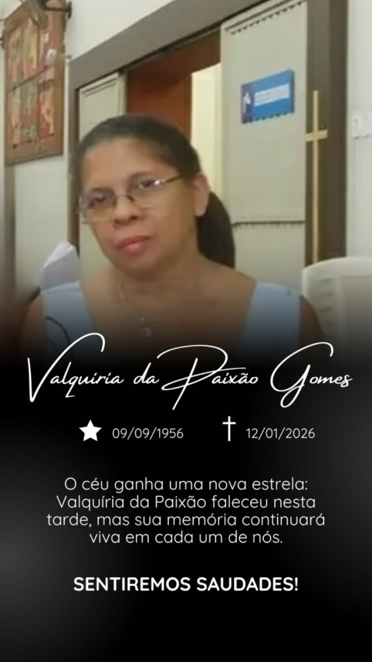 É com profundo sentimento de pesar que comunicamos o falecimento Valquíria da Paixão Gomes, aos 68 anos, ocorrido nessa segunda-feira, 12 de janeiro de 2026.